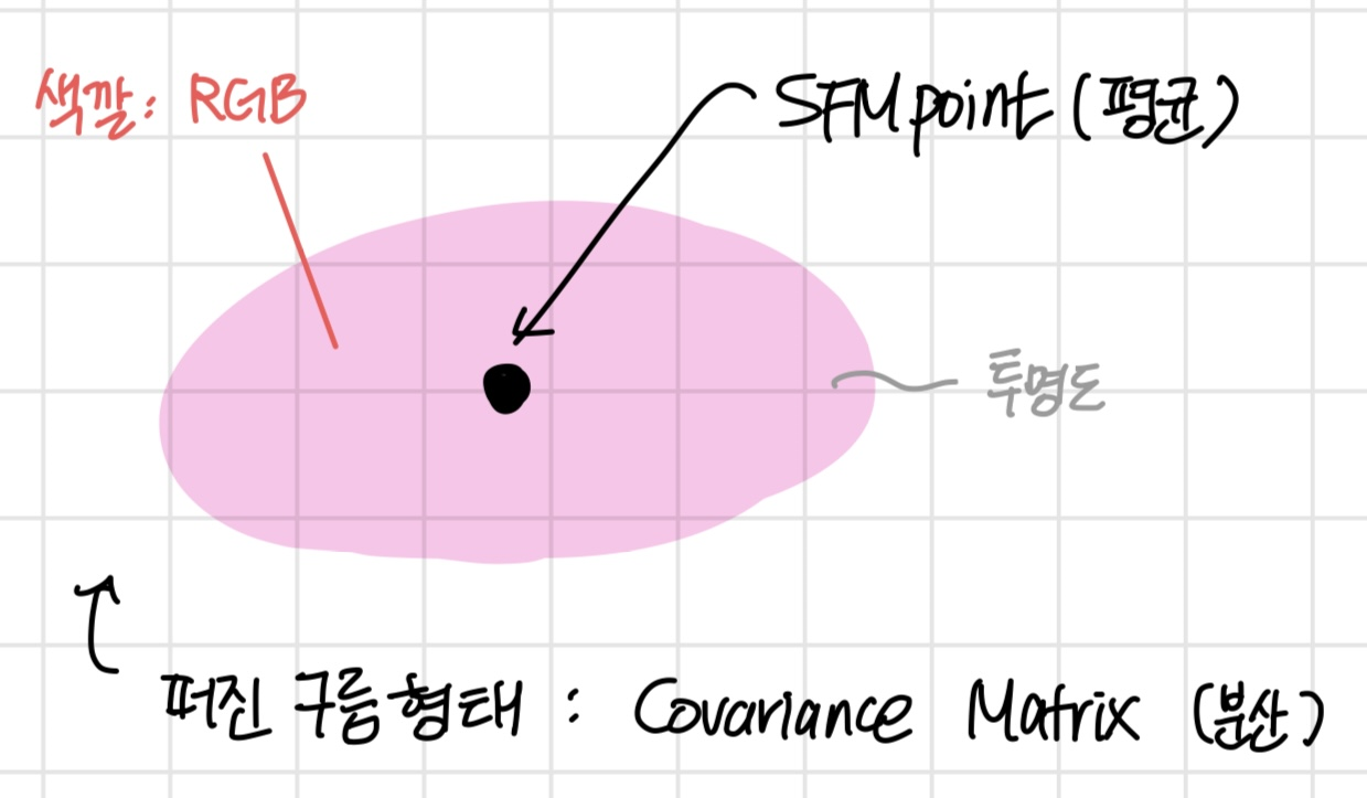 3D Gaussian์ (1) point(mean) (2) covariance matrix (3) ํฌ๋ช ๋ opacity $\alpha$ (4) SH-based color๋ก ์ ์๋๋ค.